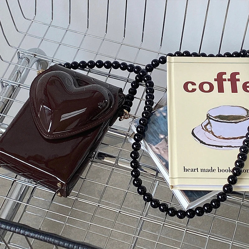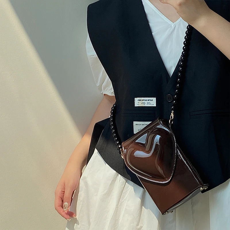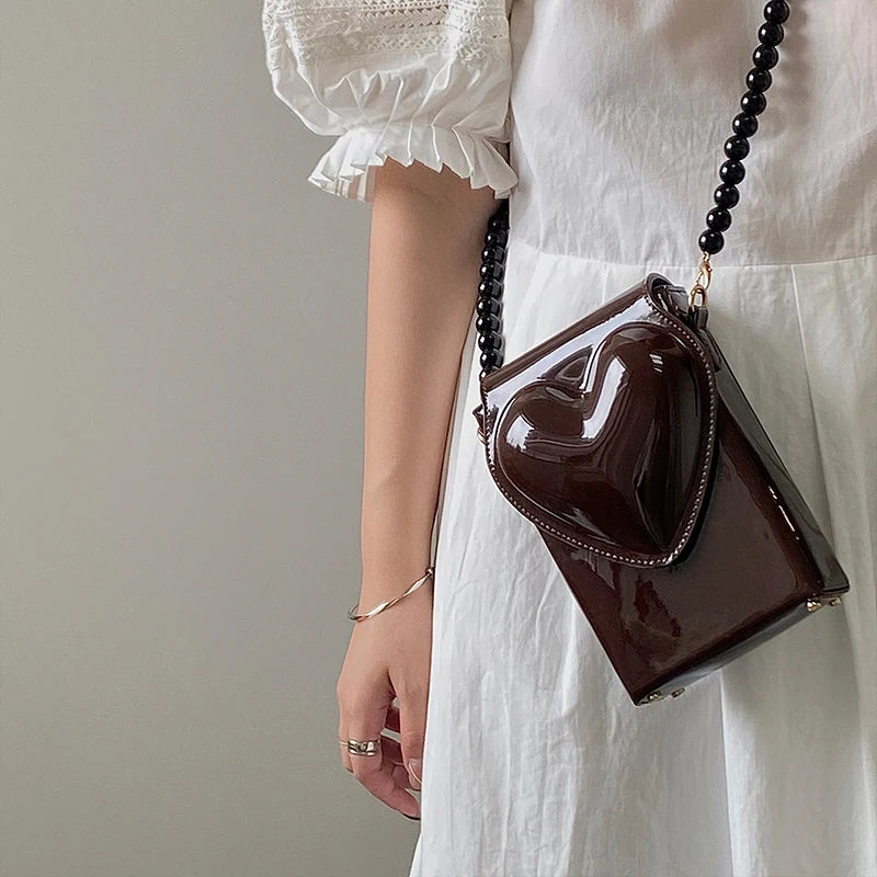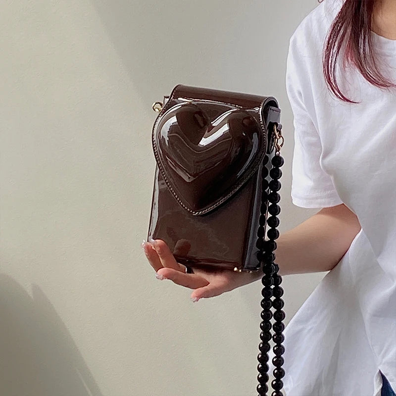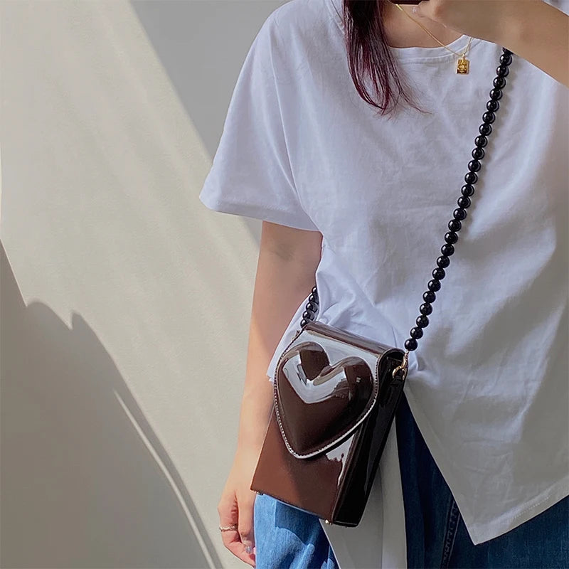 This small square shoulder bag is designed in hot girls style with a love heart accent. It features a beaded chain, making it a fashionable and versatile accessory that can hold your phone and essentials.