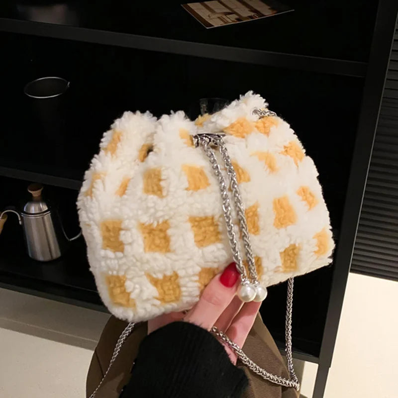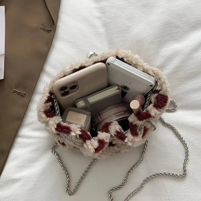 This stylish bucket bag is perfect for parties, travel, or everyday use. It features a soft wool fur exterior, chain crossbody strap, and a detachable shoulder strap.