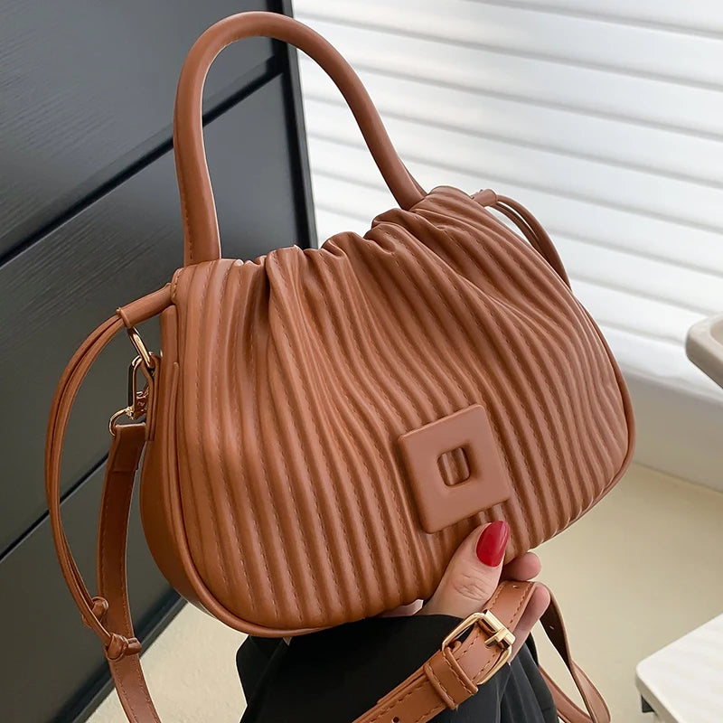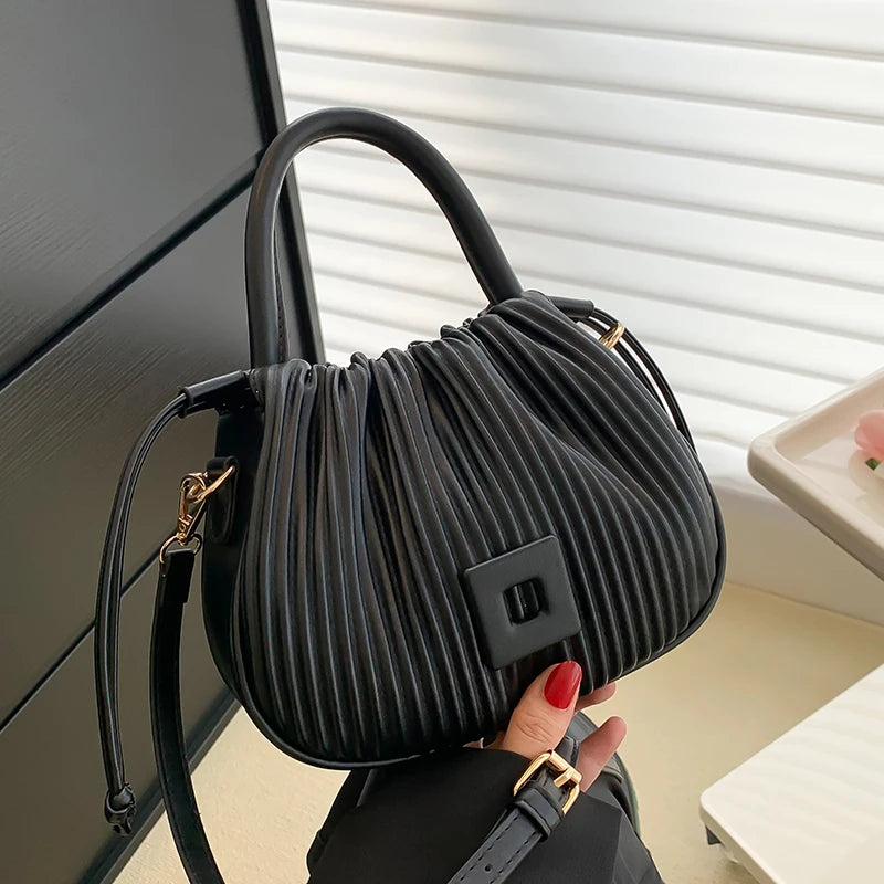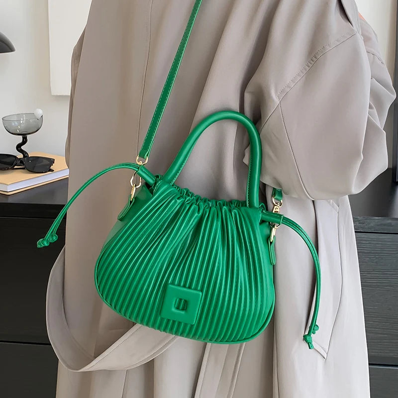 This stylish bucket handbag is perfect for any occasion. It features a pleated design, drawstring closure, and a versatile shoulder strap. Ideal for parties or as a chic everyday clutch.