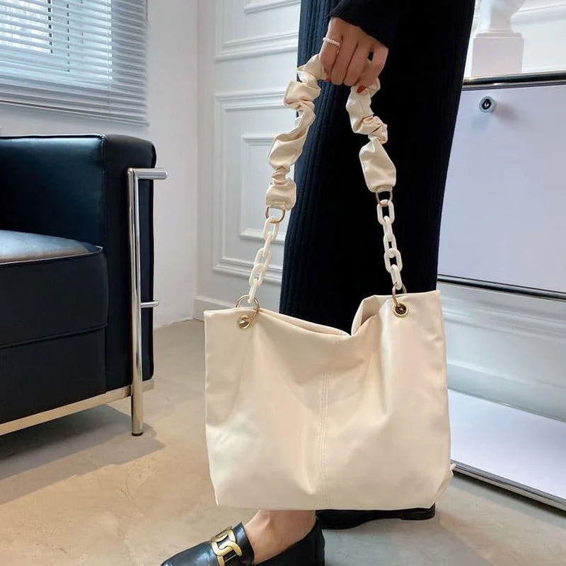 This shoulder bag is made of high-quality PU leather with a pleated design, large capacity, and a hasp closure. It features an underarm texture perfect for office and casual wear.