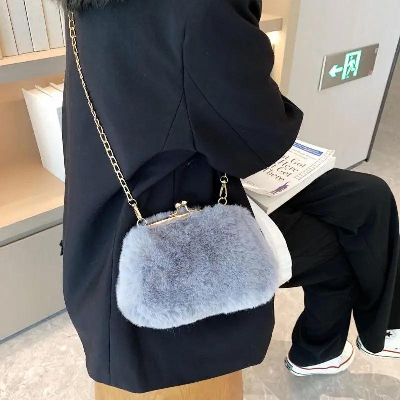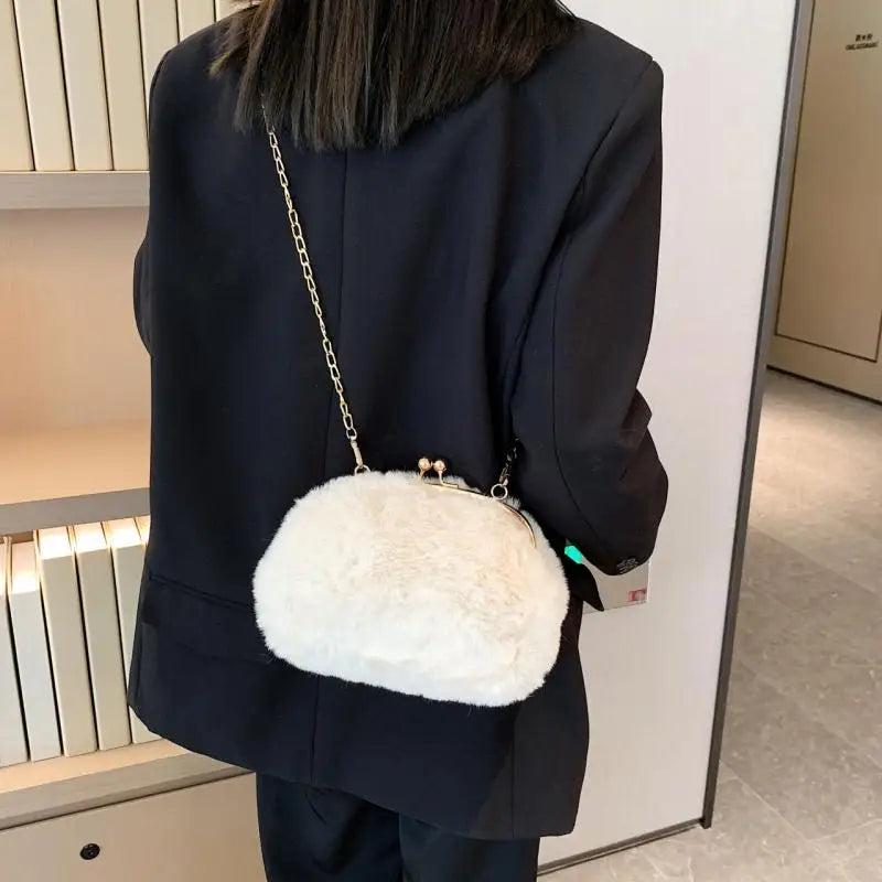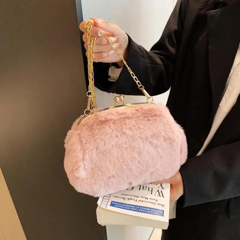 Stay stylish and warm with this plush faux fur evening bag featuring a chain shoulder strap. Perfect for winter outings, parties, and events.