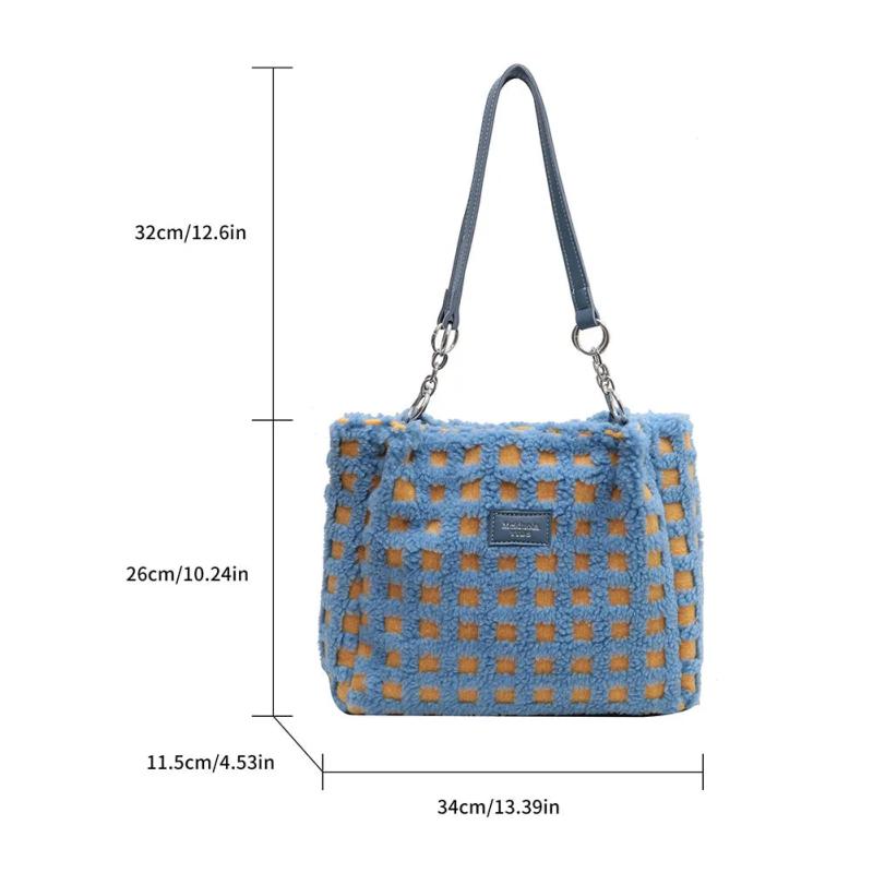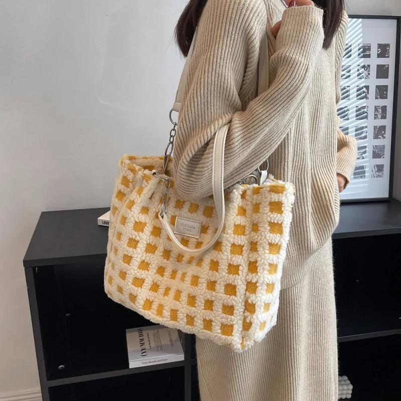 This casual shopping tote bag features a plush plaid design with a zipper closure, ideal for female travel. It offers a large capacity and is portable for everyday use.