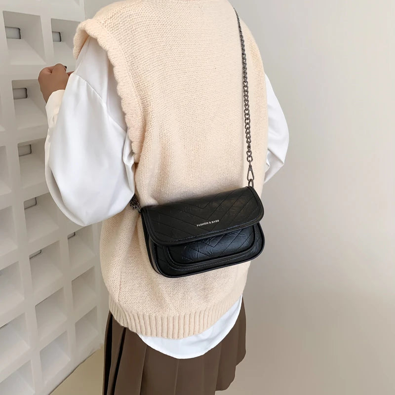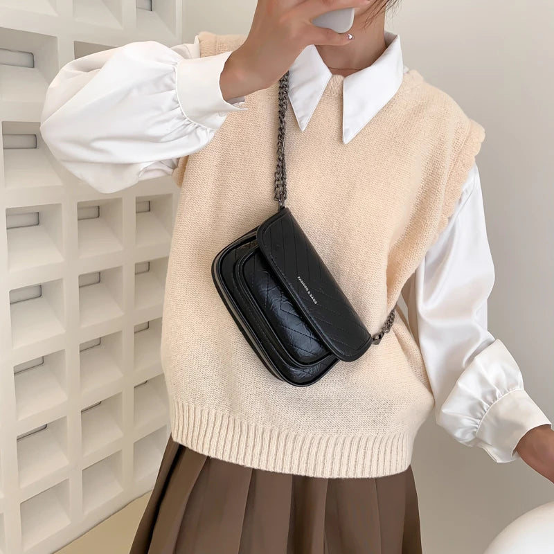 Stylish small crossbody bag made of high-quality PU leather. Features a flap closure and chain shoulder strap. Perfect for women who love fashionable accessories.