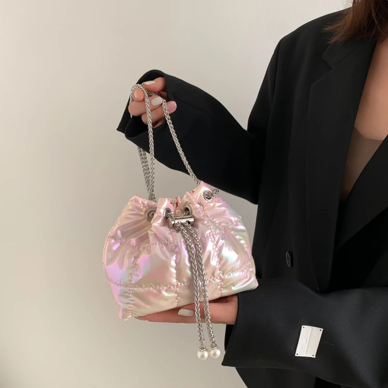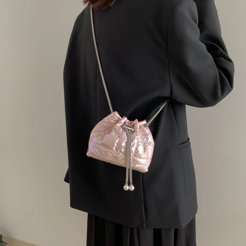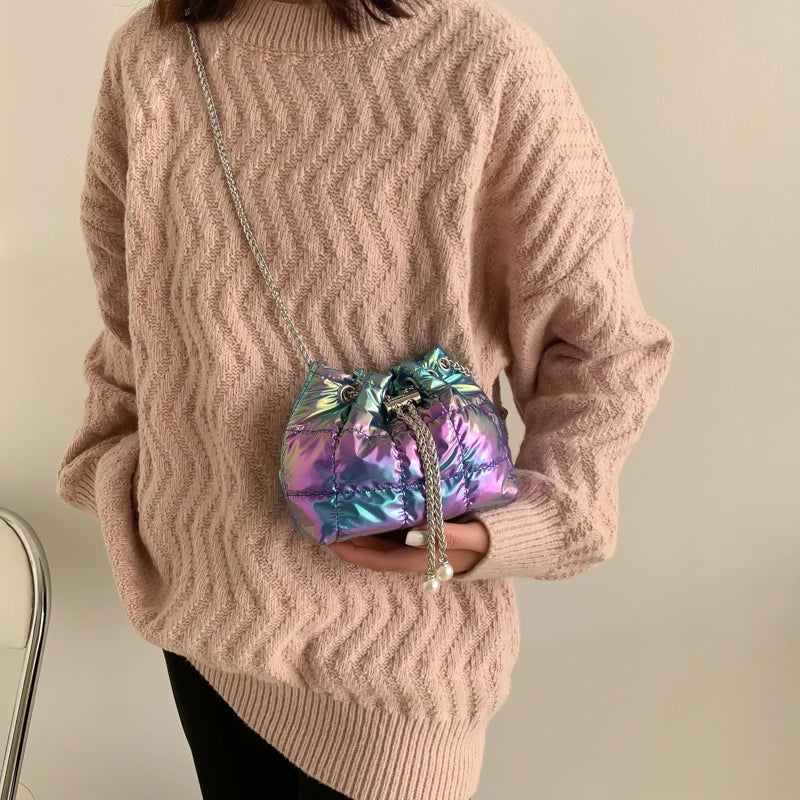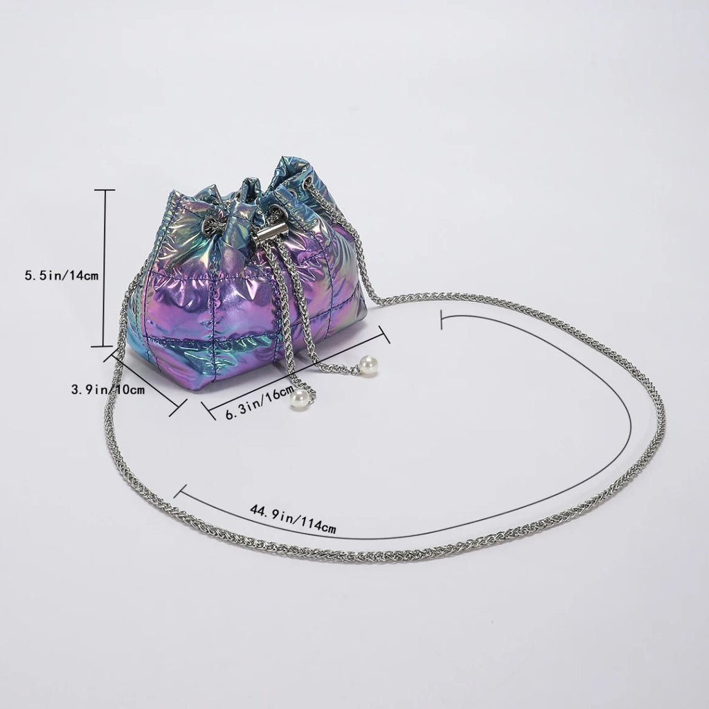 This stylish purple quilted cotton shoulder bag is perfect for daily use. It features a space handbag design with a bucket crossbody bag and mini purse.