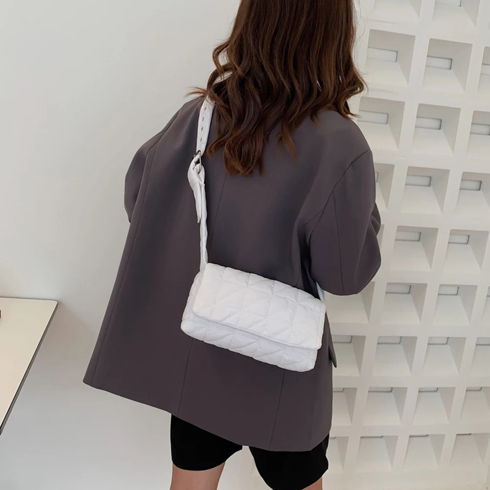 Stay stylish with this quilted crossbody purse featuring a chic belt buckle design.