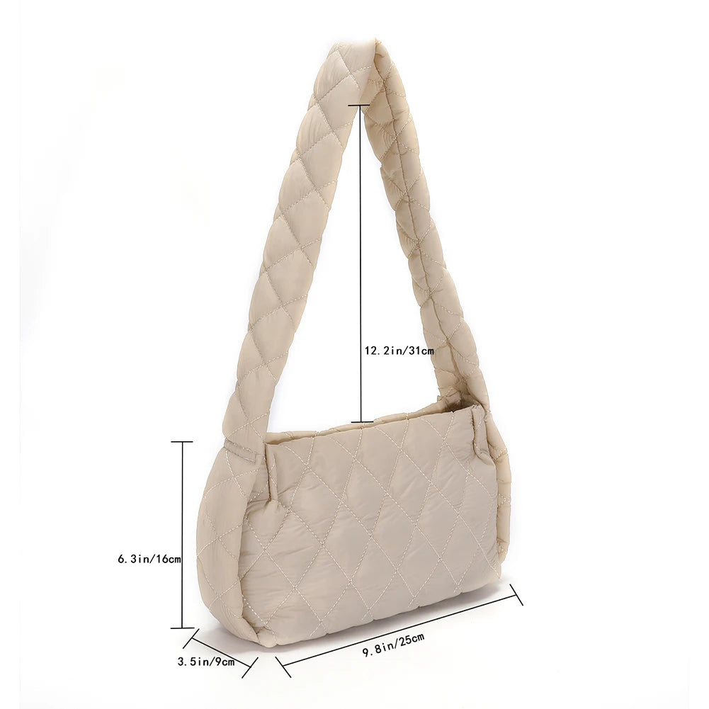 Stay stylish and organized with this quilted nylon shoulder bag. Perfect for the winter season.