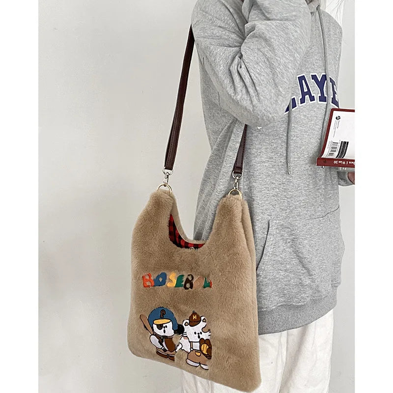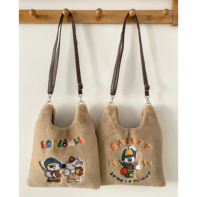 Stay stylish and organized with this large capacity handbag designed for women. Perfect for winter, this plush shoulder bag features cute rabbit embroidery.