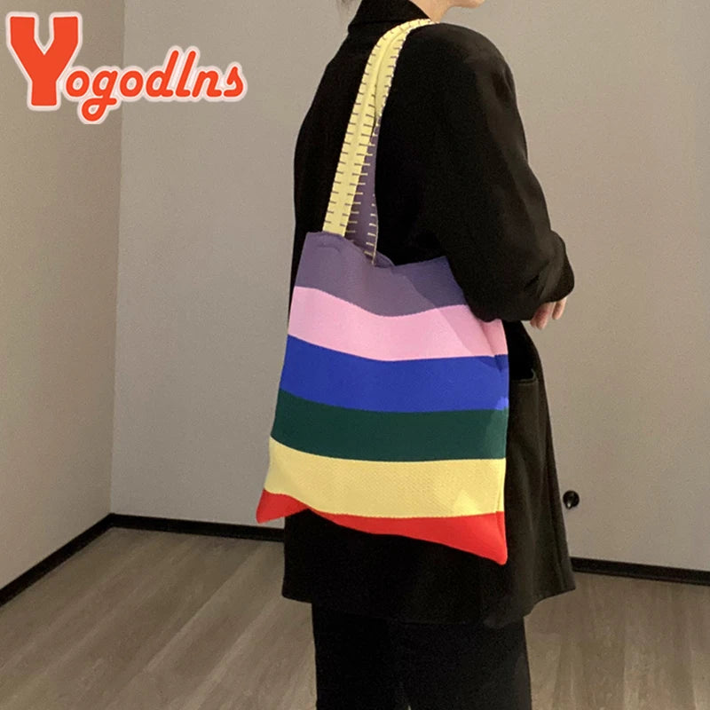Rainbow Stripes Knitted Shoulder Bag For Womens High Shopping Tote Woven Handbag