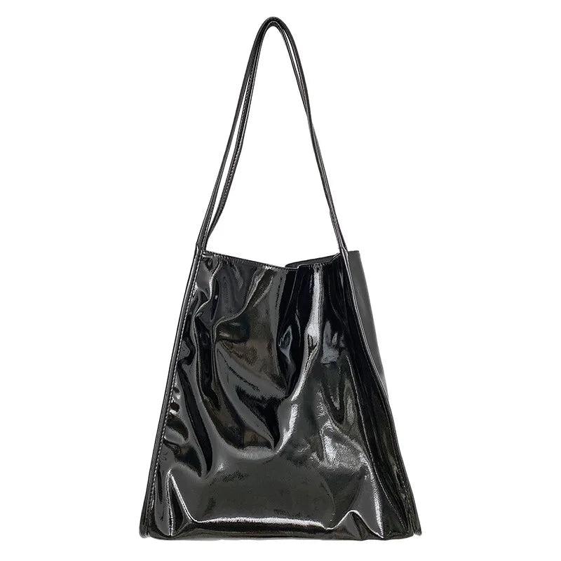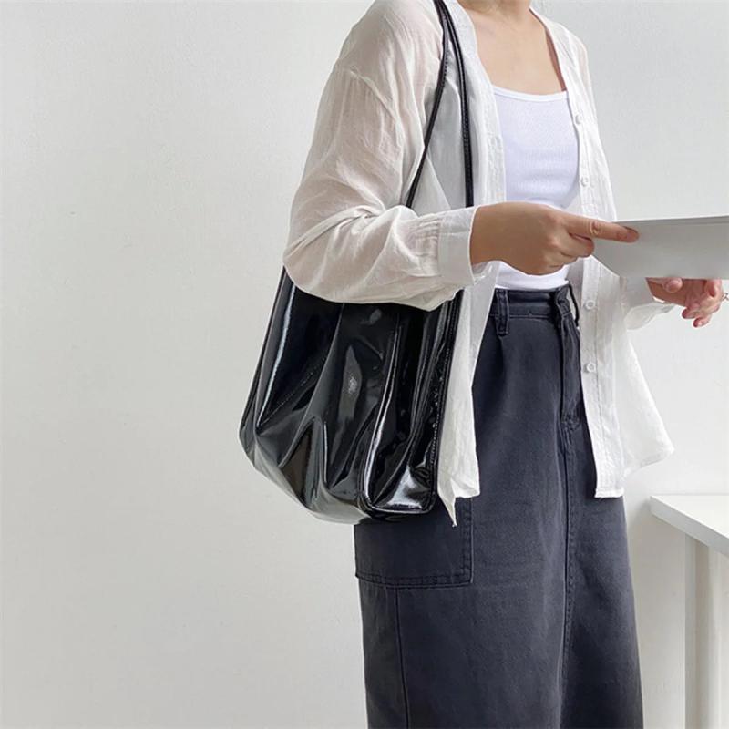 Elevate your style with this retro-inspired patent leather handbag that is perfect for shopping and everyday use.