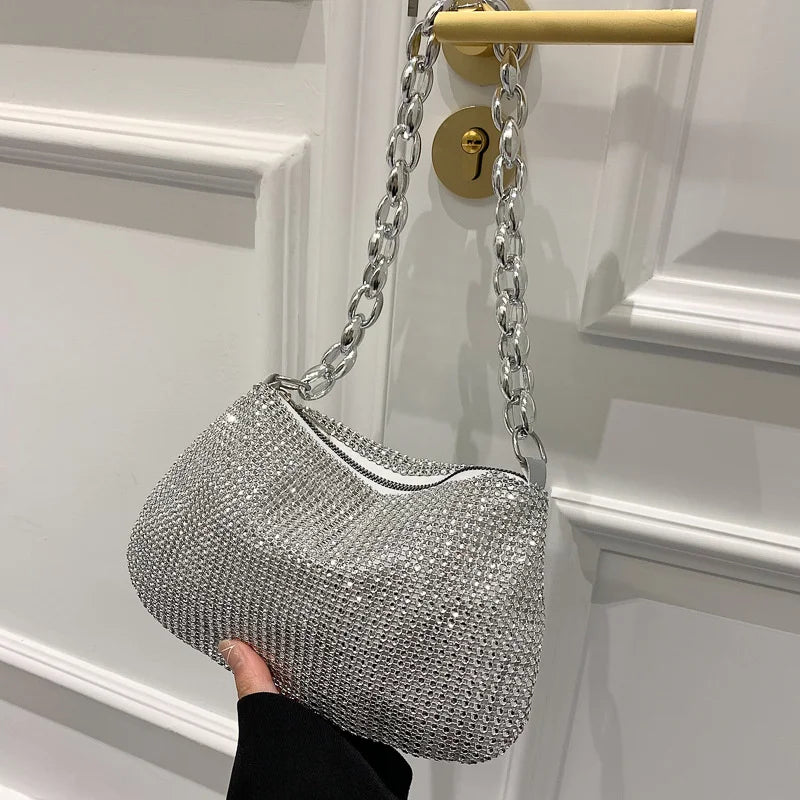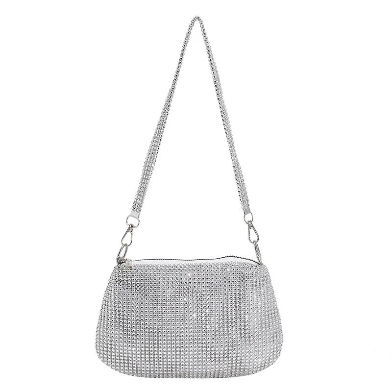 Elegant and sparkly, this shoulder bag is perfect for evening events, parties, weddings, and more. It features rhinestones and is designed as a clutch handbag for a touch of glamour.