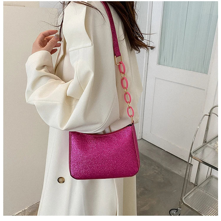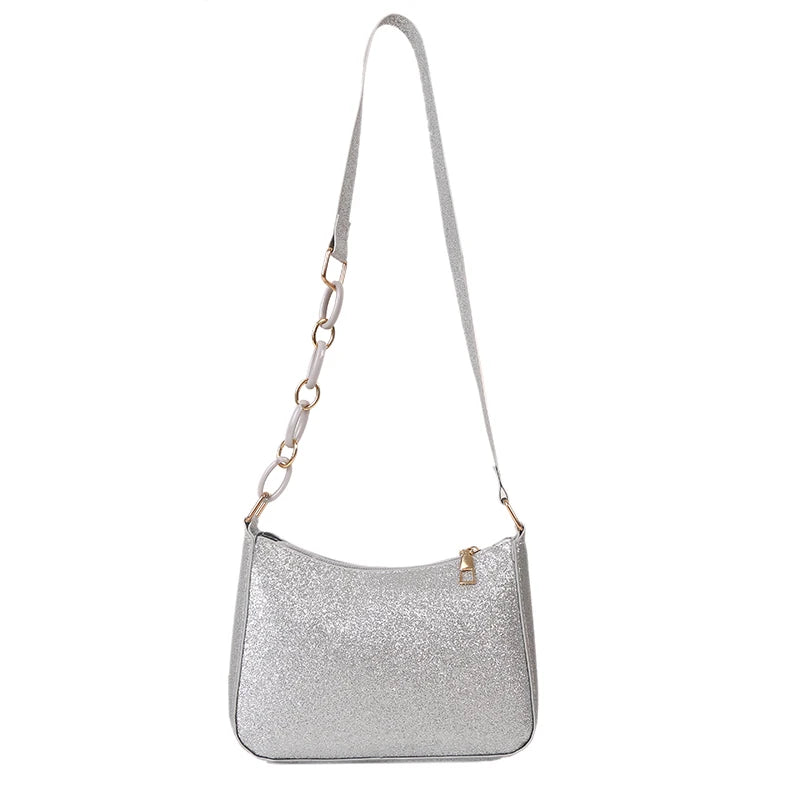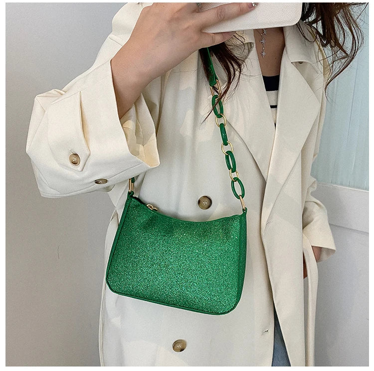 This stylish sequin shoulder bag is perfect for parties and special occasions. It features an acrylic chain and can be used as an underarm bag or purse.