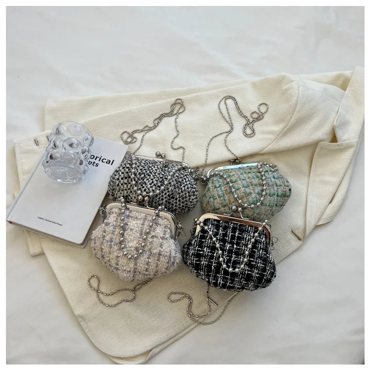This stylish handbag is perfect for the fall and winter seasons. It features a shell-shaped design with beads and chains, made from high-quality PU leather and tweed material.