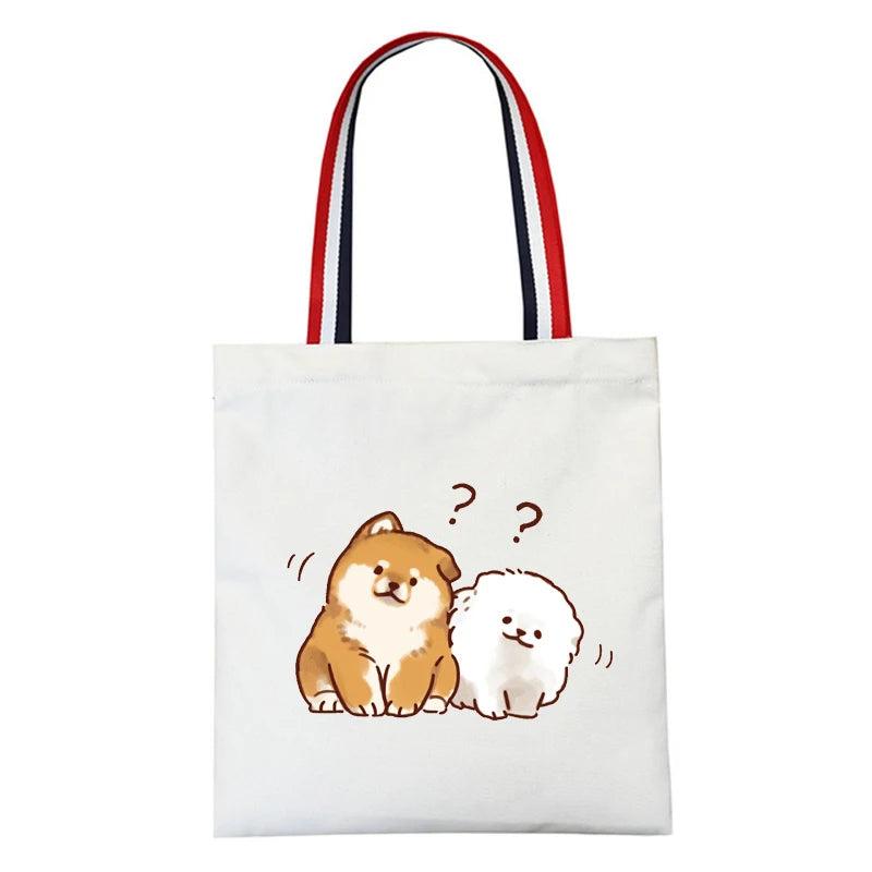 This shoulder bag features a cute Shiba Inu dog design on durable canvas material. It offers a large capacity for shopping and books.