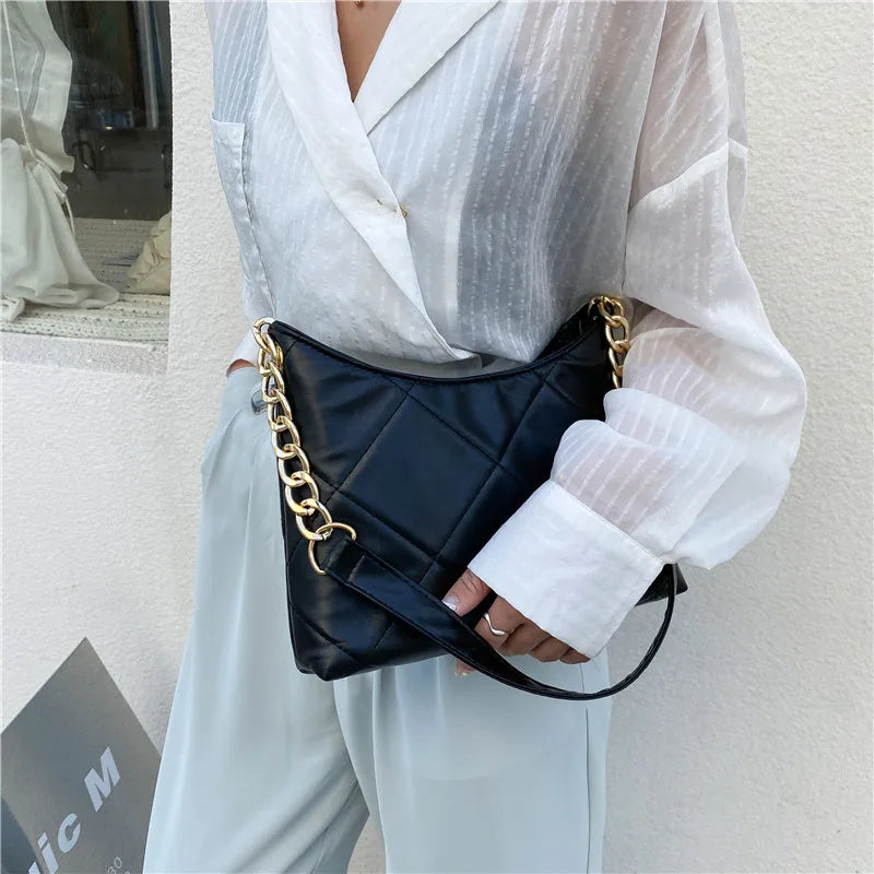 Elegant and stylish PU material shoulder bag with a diamond shape design. Features a chain strap and perfect for daily use.