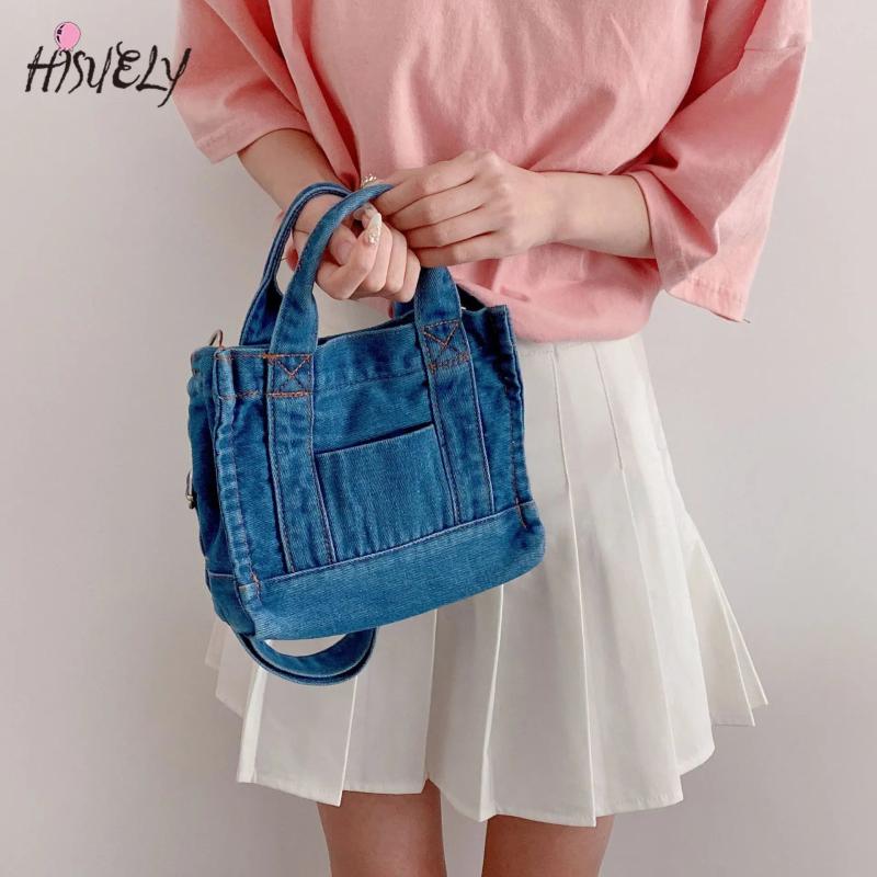 Small Denim Cloth Women Shoulder Bag Casual Tote Detachable Strap Zipper Purse