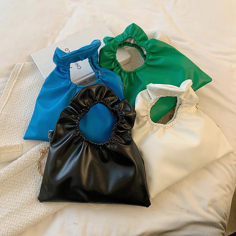 Stay stylish with this small PU leather tote featuring a round handle. It can be folded for easy storage and also functions as a chain crossbody shoulder handbag for versatile use.