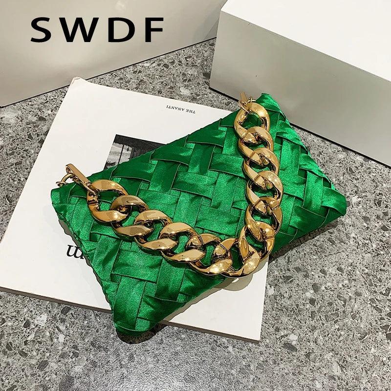 Stay chic and elegant with this small soft fabric weave crossbody bag perfect for summer. It features a thick chain strap for added style and convenience.