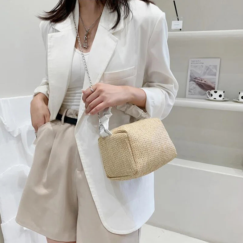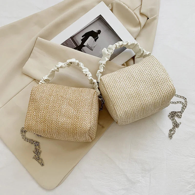This casual shoulder bag is perfect for any outfit. Made of straw, it features a chain strap for easy carrying.