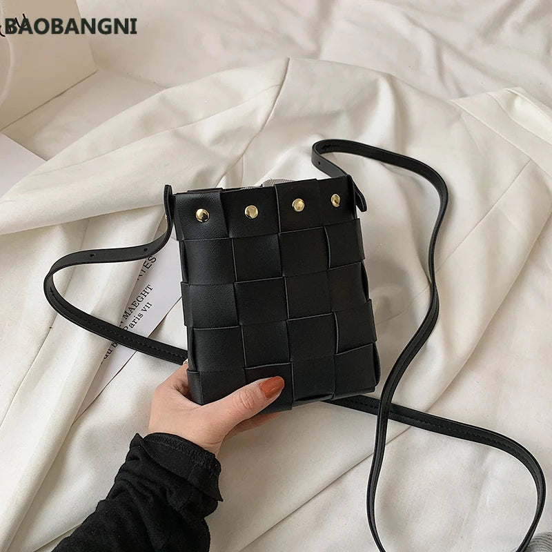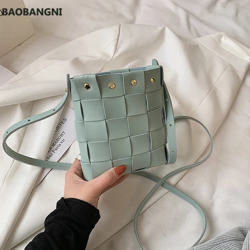 Small Weave Bucket Shoulder Bags Soft Leather Messenger Bag Rivet Crossbod
