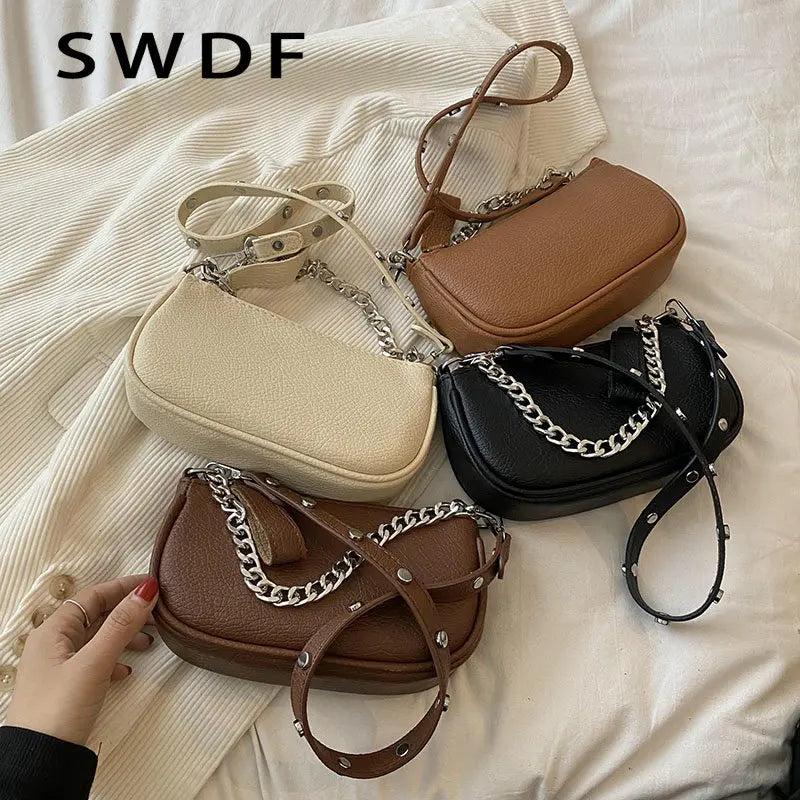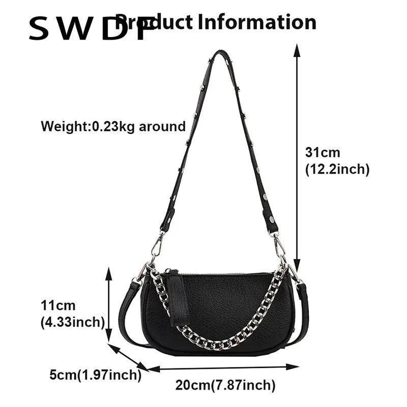 Soft Leather Crossbody Bag with Thick Chains, Rivet Shoulder Bag for Women