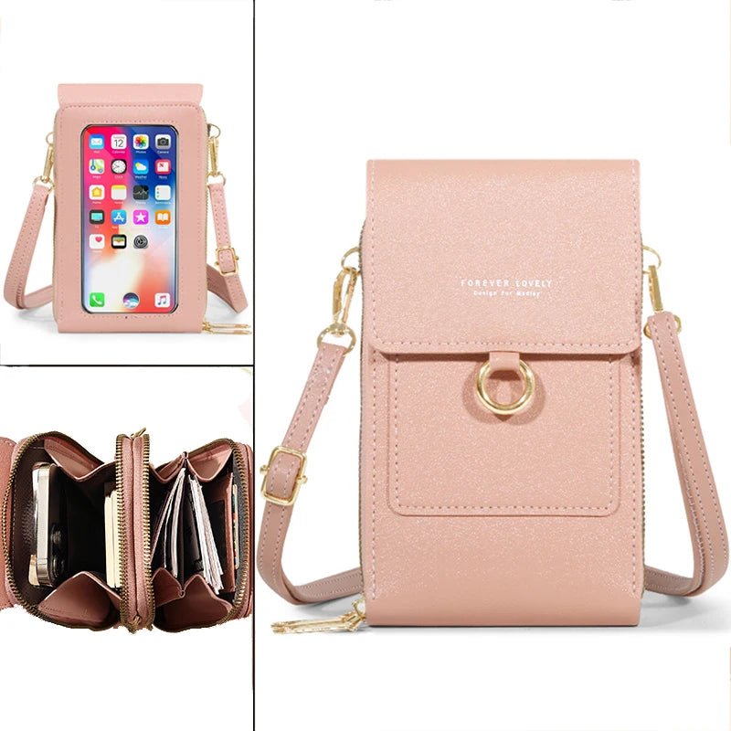 This stylish women's bag is made of soft leather and features a touch screen cell phone purse design. It can be used as a crossbody or shoulder strap handbag.
