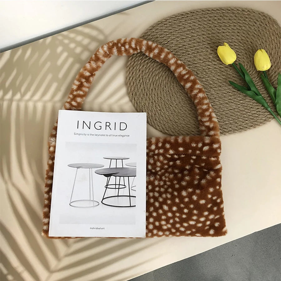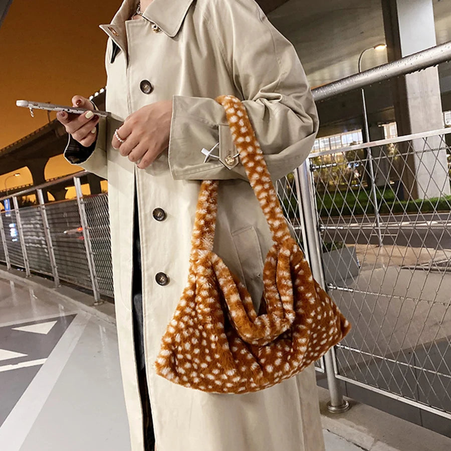 This soft plush bag is perfect for autumn/winter. It is a one-shoulder messenger bag with a dot design. Ideal for women who love stylish handbags and purses.