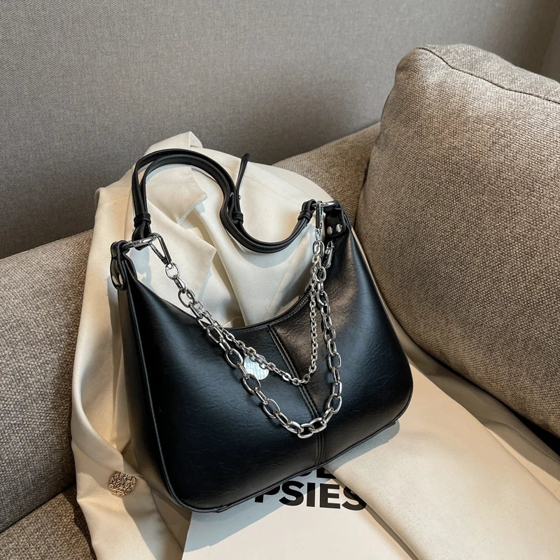This women's shoulder bag is made of high-quality leather and features a stylish silver chain strap. It's perfect for carrying your essentials in a compact and fashionable way.