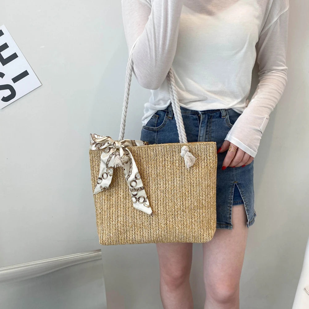 Straw Woven Shoulder Bag Silk Scarf Large Capacity Handbag