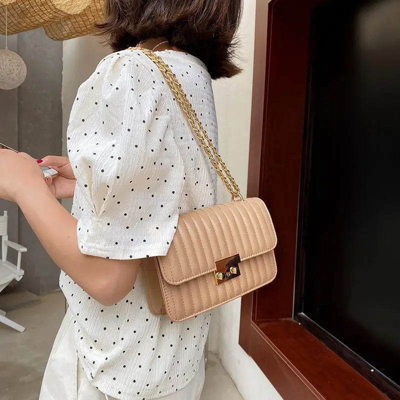 This stylish shoulder bag features a stripe print design with a chain strap, perfect for carrying your essentials in style.