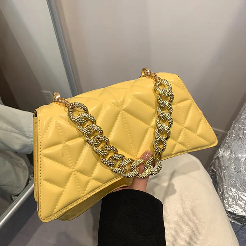 Elevate your style with this chic plaid PU leather shoulder bag. The thick chain strap adds a trendy touch to your outfit, making it a must-have accessory for any occasion.