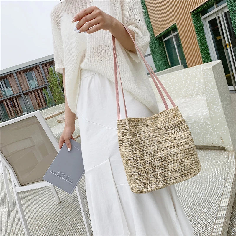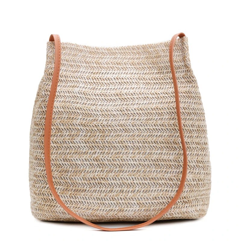 This handbag is perfect for summer days at the beach or casual outings. It features a woven rattan design with leather accents, providing a bohemian touch. The bag has a large capacity to carry all your essentials in style.