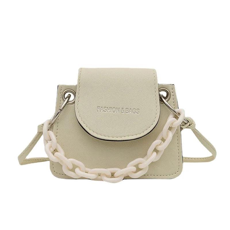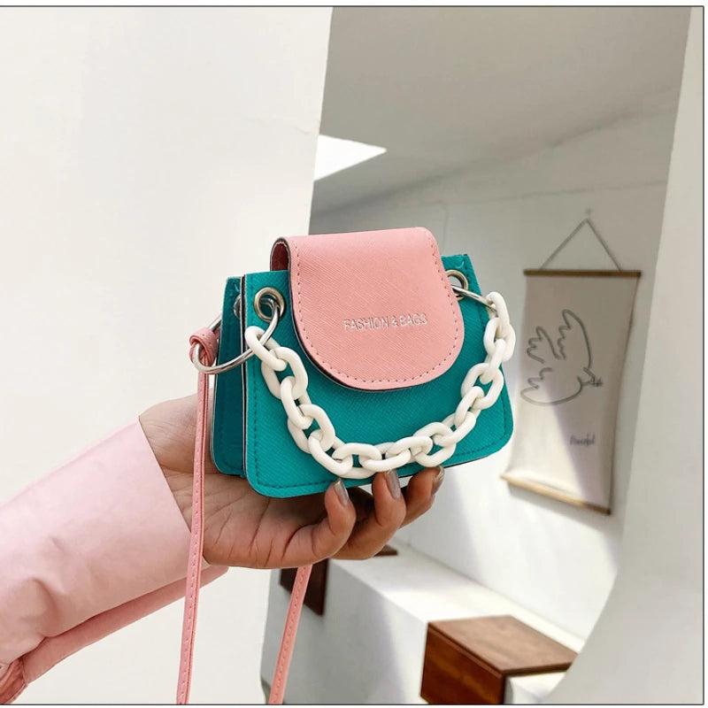 This trendy mini crossbody bag is perfect for summer outings. It features a stylish contrast design and comes with a chain strap. It's a great choice for women and girls looking for a compact yet fashionable purse.
