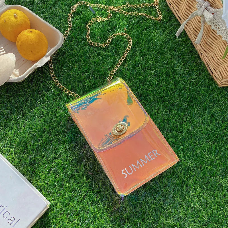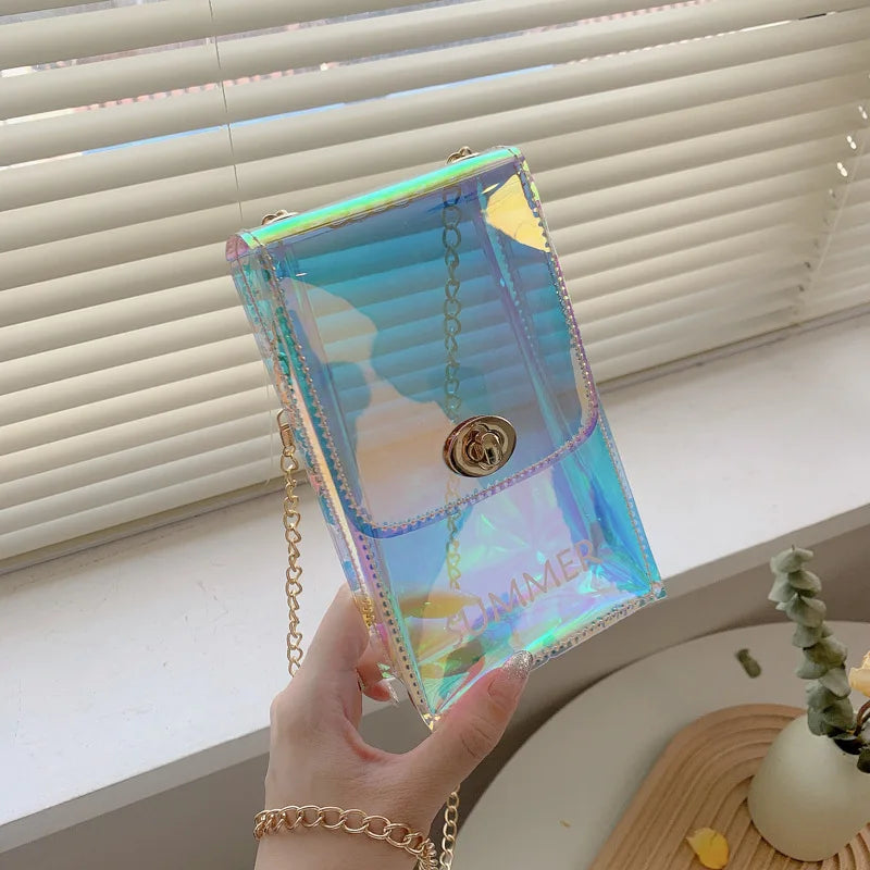 Stay stylish with this transparent laser mini chain shoulder bag that's perfect for summer. Carry your essentials in this trendy handbag.