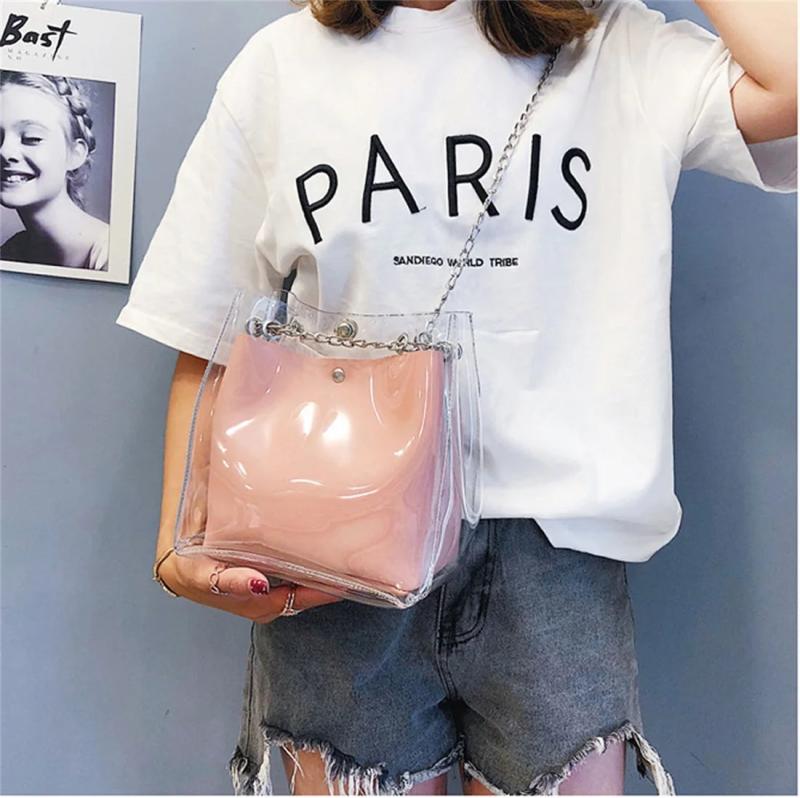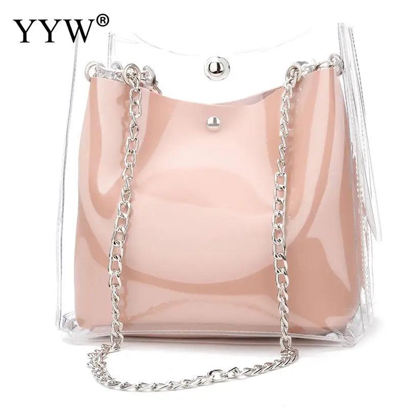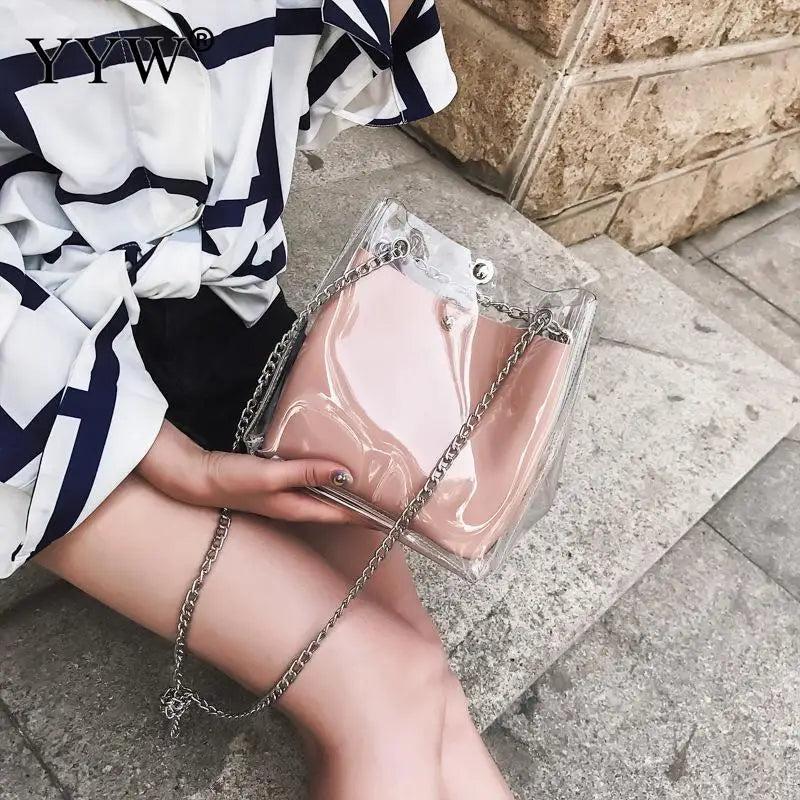 Stay trendy with this stylish PVC jelly shoulder bag that offers a large capacity for your essentials. The transparent design adds a touch of personality, and the solid chain strap enhances the overall look.