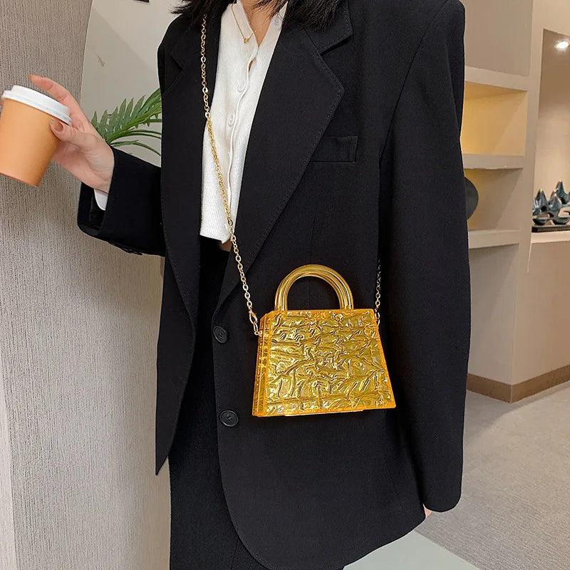 This stylish acrylic clutch is perfect for evenings out, featuring a transparent design with a top handle and chain strap. It can hold essentials such as your phone, lipstick, and other small items.