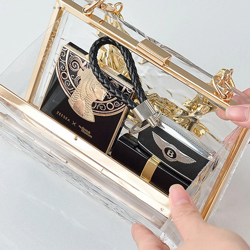 This unique handbag is perfect for weddings and parties, featuring a transparent design that allows you to showcase your belongings. Can be worn over the shoulder or as a crossbody bag.