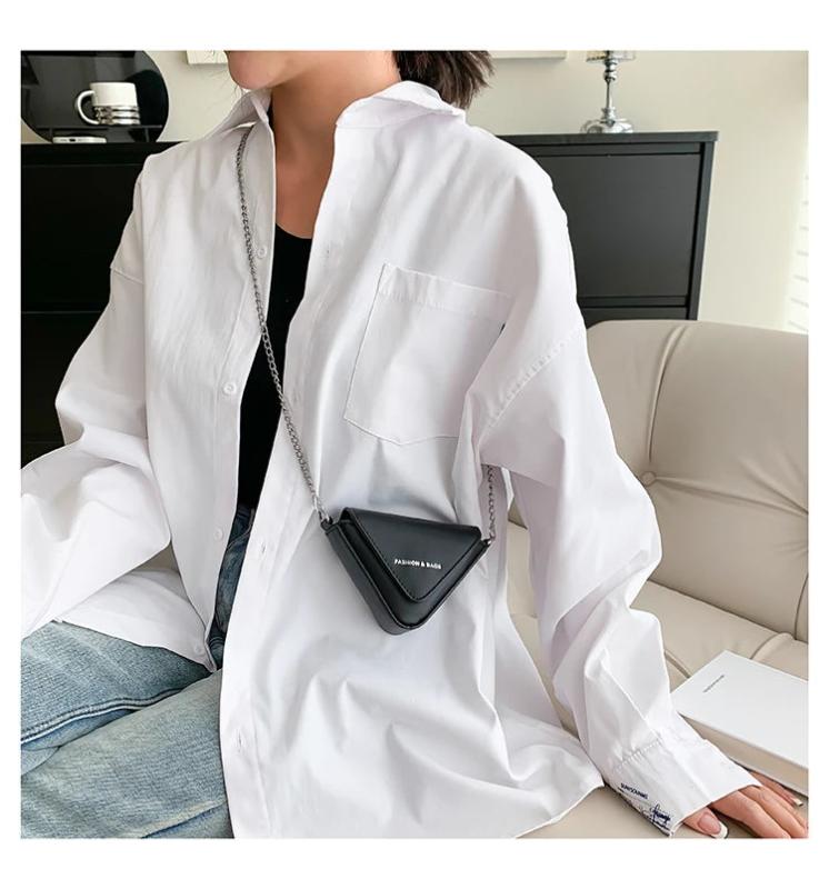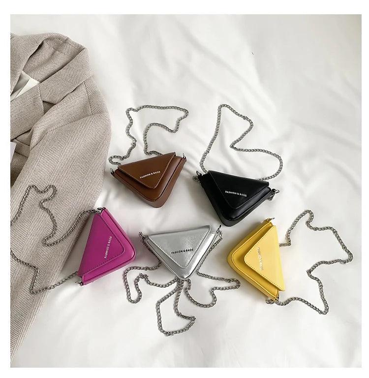 This stylish mini chain shoulder bag is perfect for women who want a compact and fashionable purse. It features a triangular shape and a chain strap for a chic look.