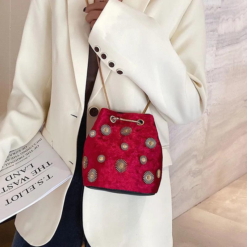 Velvet Bucket Bag Crossbody with Golden Chain Strap