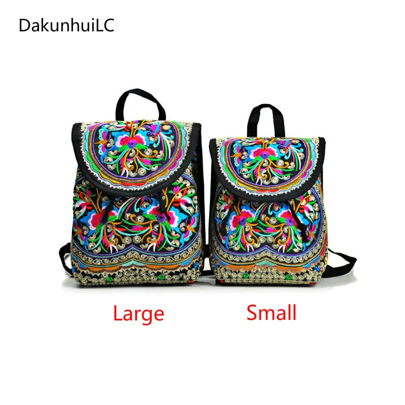 This vintage style backpack features intricate embroidery and ethnic design, perfect for travel and everyday use. Available in large and small sizes.