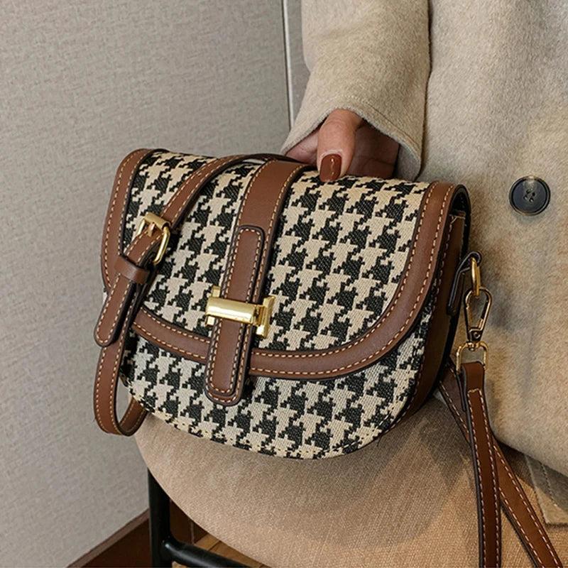 Vintage Houndstooth Shoulder Bag Women PU Leather Handbag Crossbody Saddle Cover