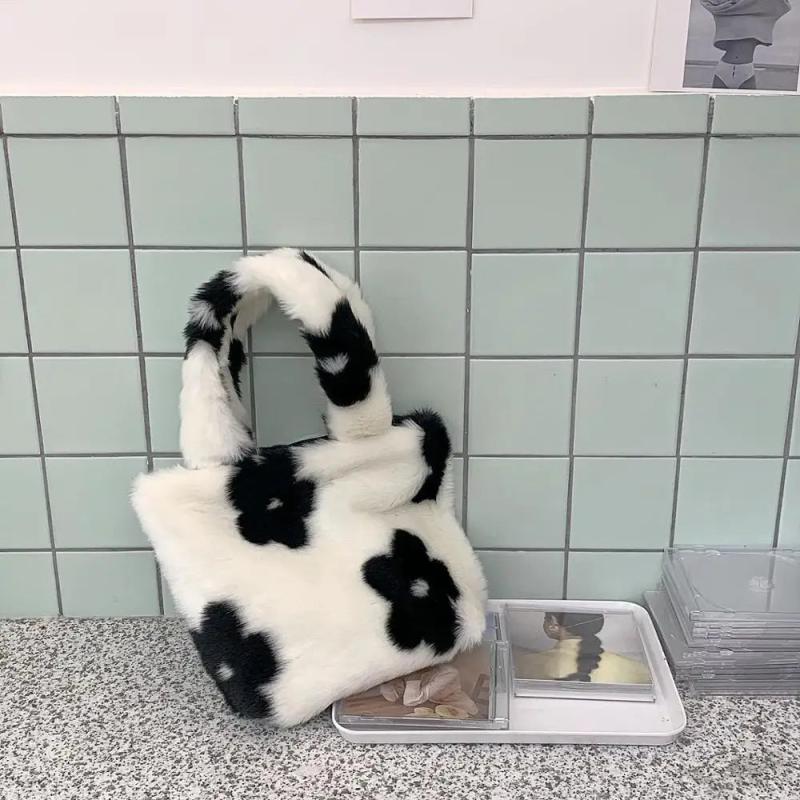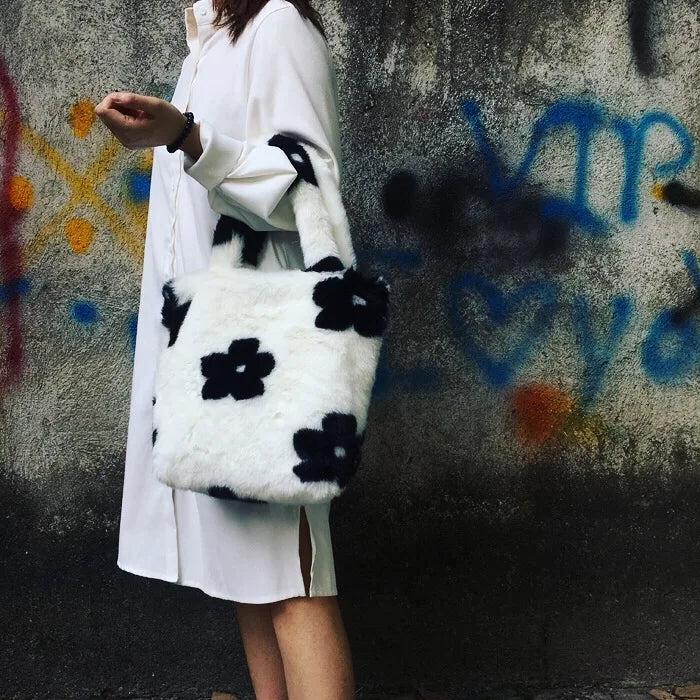 Stay stylish with this vintage plush handbag featuring a flower pattern design. Perfect for the winter season, this small shoulder bag is ideal for carrying your essentials. It can also be used as a clutch purse for a versatile look.