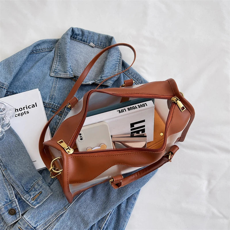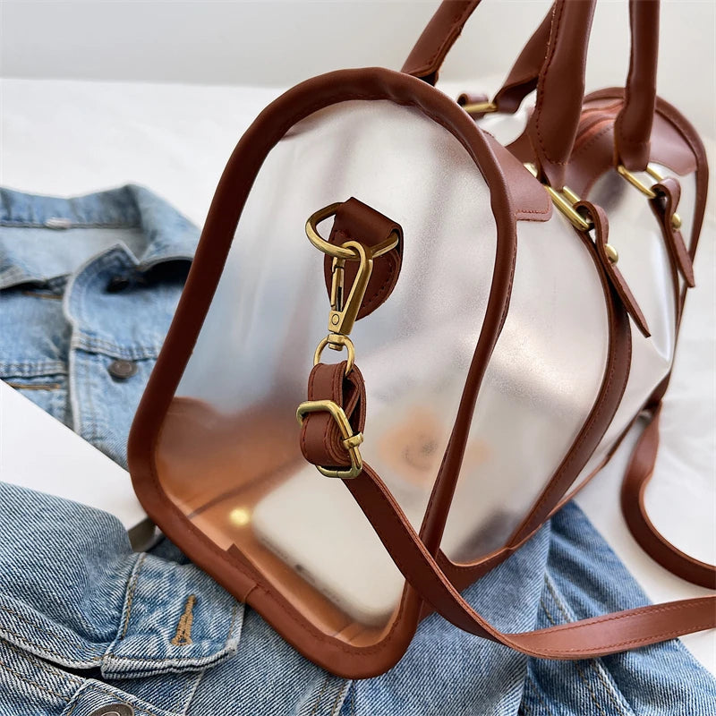 Stay stylish and organized with this transparent PVC duffle bag perfect for travel, featuring a shoulder strap for easy carrying.