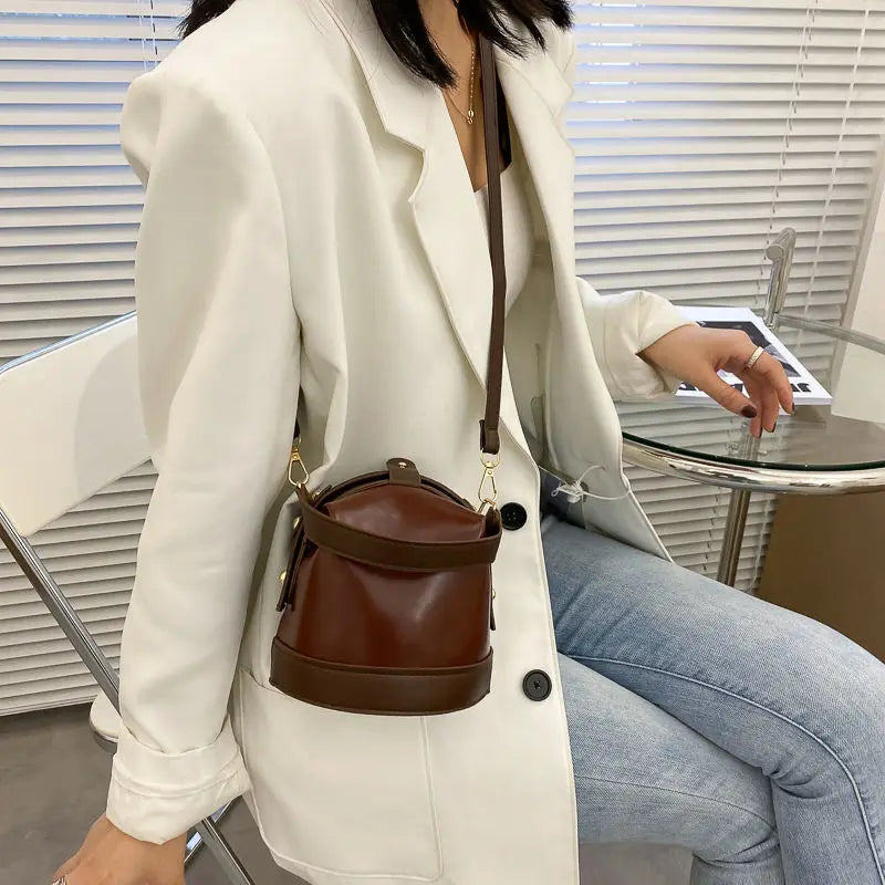 This small bucket bag is a versatile accessory for the autumn and winter season, featuring a trendy Western style design.