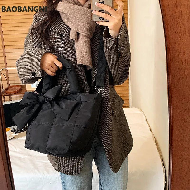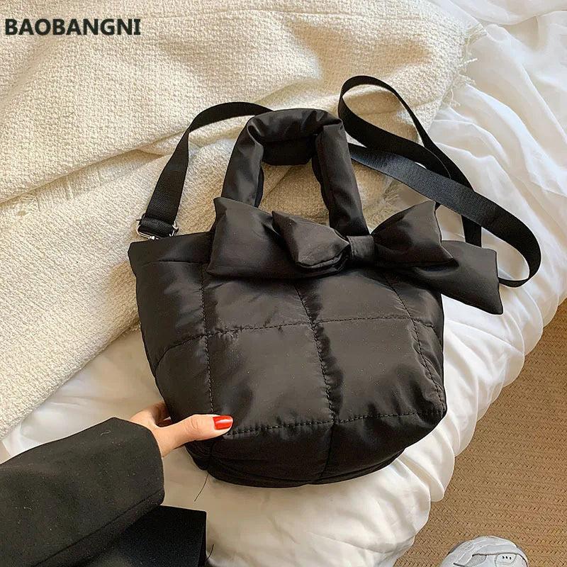 Description:Stay stylish and warm with this small tote shoulder bag made from down cotton. Perfect for carrying your essentials during the winter season.Features: Made from high-quality Oxford cloth material Features a charming bow design on the front Perfect size for carrying essentials like phone, wallet, keys, and more Can be...