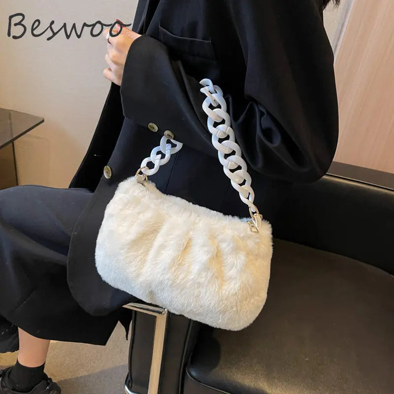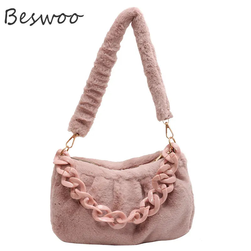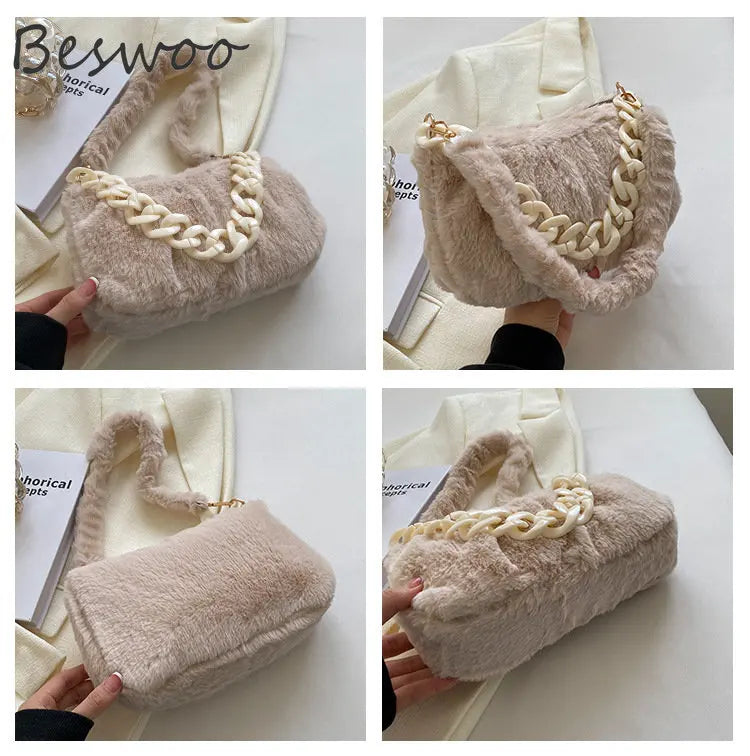 Stay stylish and cozy with this soft plush handbag. Featuring a fluffy fur design, this shoulder bag is perfect for winter outings.