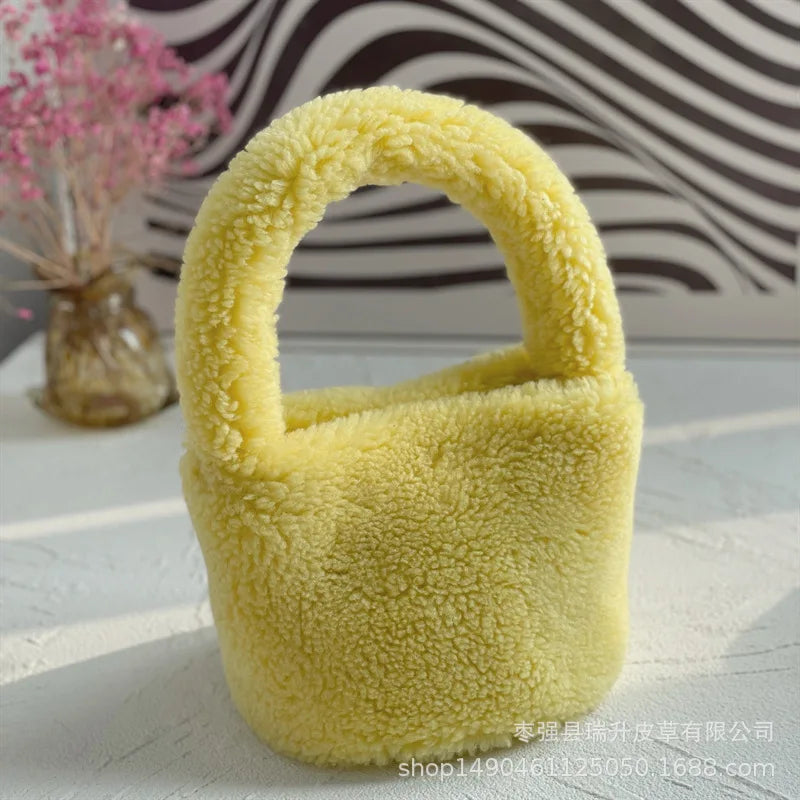 Winter Furry Women Bag Vegetable Basket Handbag Plush Magnetic Cylinder Bag