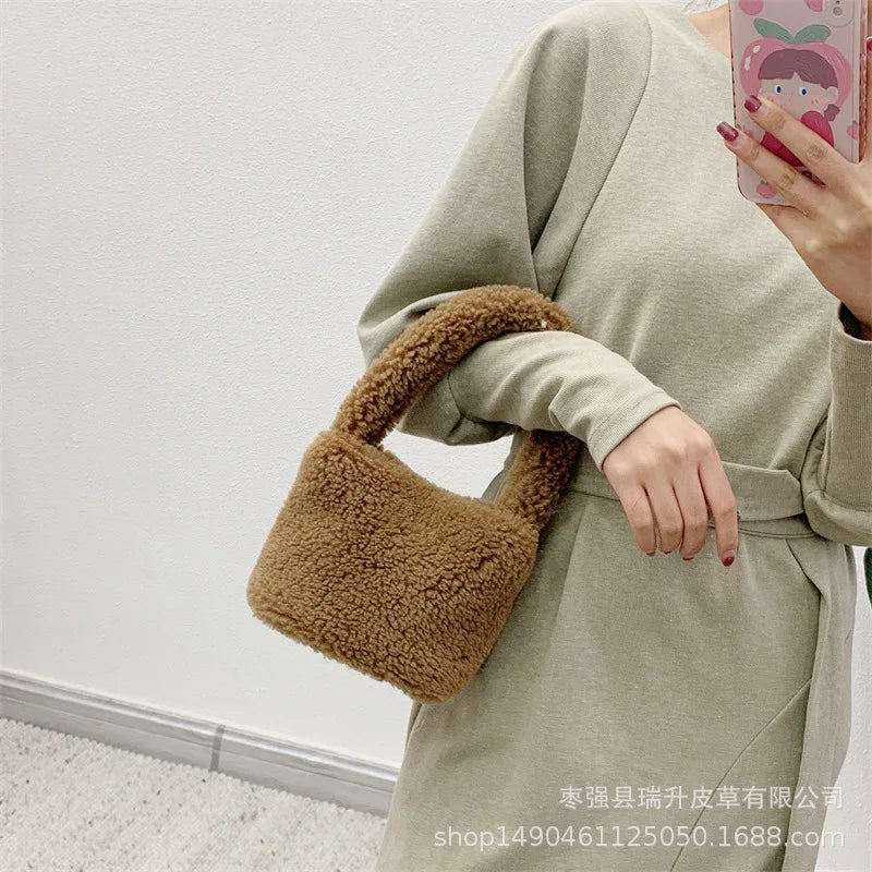 Stay cozy and stylish with this autumn and winter furry female bag made of particle wool. Features a magnetic buckle closure and a unique vegetable basket design.