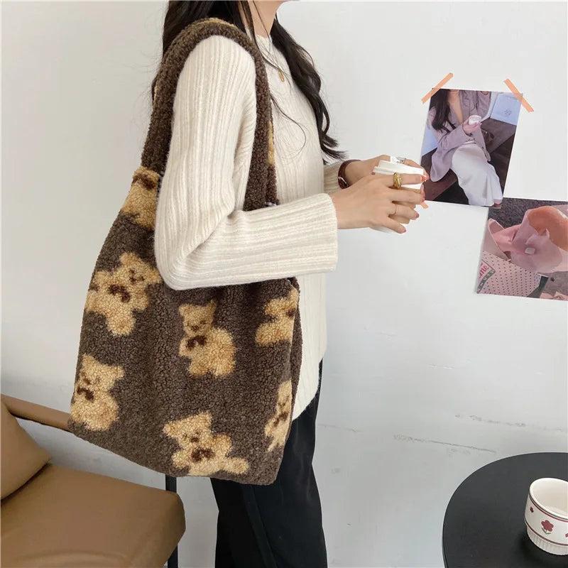 Winter Soft Plush Bear Handbags for Women Shoulder Bag Large Capacity