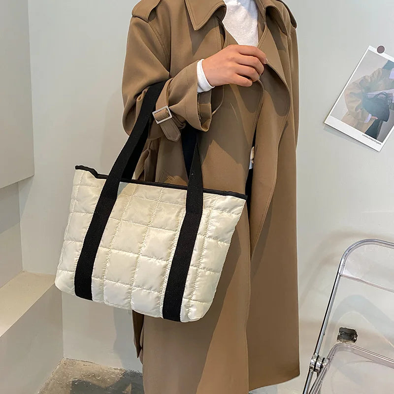 Stay warm and stylish with this winter handbag featuring space pad cotton and feather down material. Perfect for everyday use with a top-handle design.