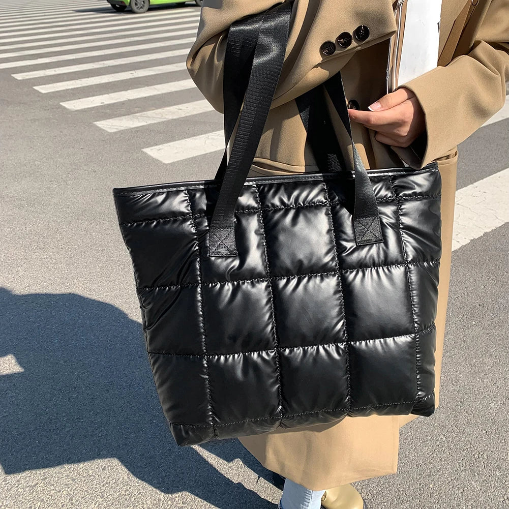 Stay stylish and warm with this space padded quilted purse handbag. Perfect for shopping, this tote bag is a must-have for any fashion-forward woman.